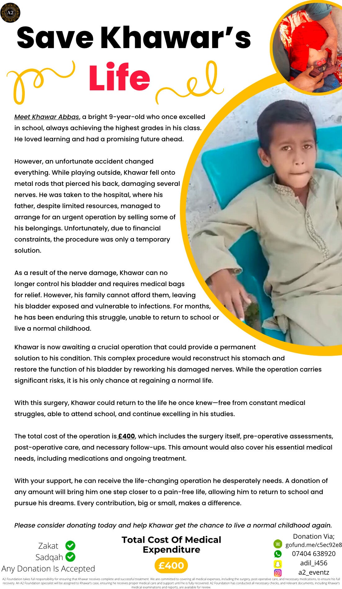 Please consider donating today and help Khawar get the chance to live a normal childhood again.